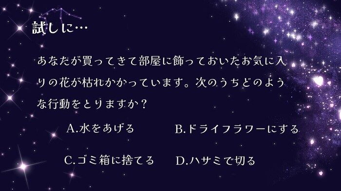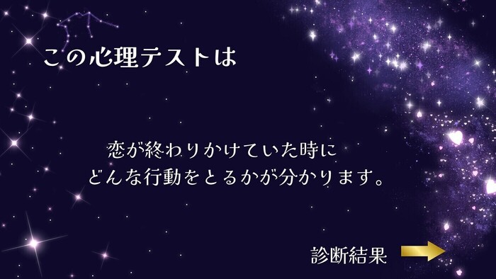 実は先に紹介した心理テストでは、[恋が終わりかけていた時にどんな行動をとるか]が分かるそうです。では、診断結果をみてみましょう。