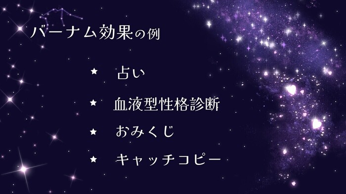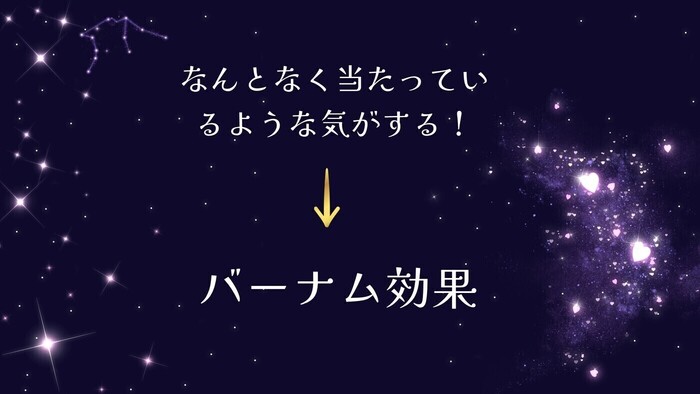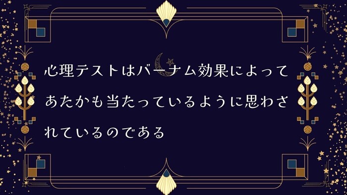 みなさんは診断結果を見て、どう思いましたか?だいたいの人は合ってるかもーとか思ったりしませんでしたか?このようにまるで自分のことを言い当てられているように感じてしまう心理や現象のことをバーナム効果といいます。