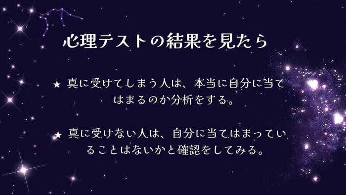このように気分を上下させてしまうのも心理テストであります。 心理テストの結果を信じてしまう人、信じない人といろいろとタイプがいるとは思いますが、ここで私の考えを伝えたいと思います。 真に受けてしまう人は、本当に自分にあてはまるのか分析する。真に受けない人は、自分に当てはまっていることはないかと確認をしてみるのも良いかもしれません。