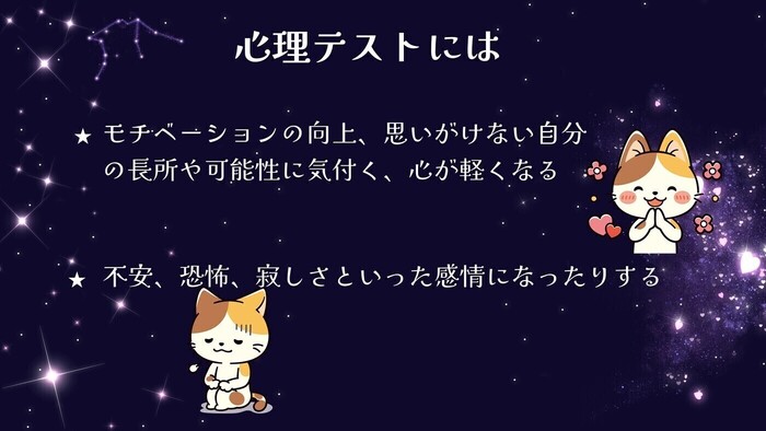 心理テストには、前向きな言葉やコメントをかけられることによって、モチベーションが高まったり、心が軽くなったり、また、思いがけない自分の長所や可能性に気づくことだってあるかもしれません。しかし一方で、不安や恐怖、寂しさといった感情に苛まれるかもしれません