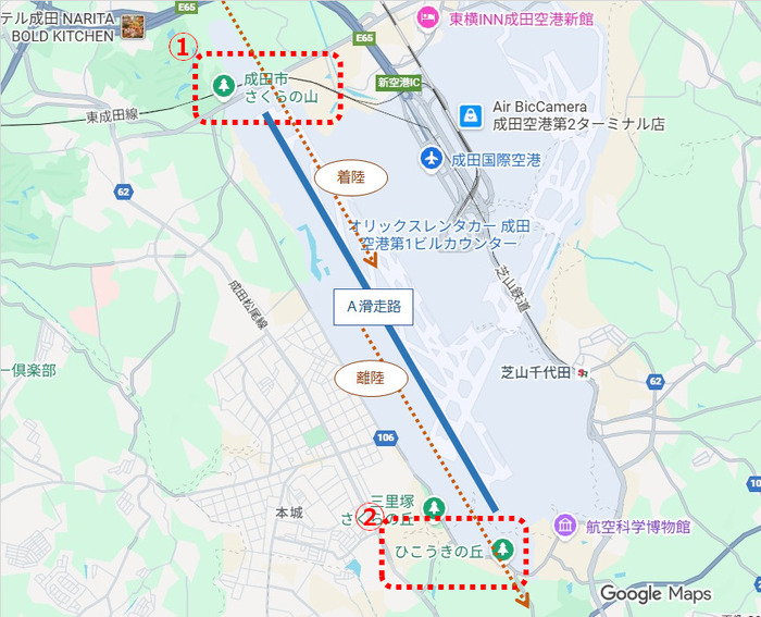 いずれも成田空港のA滑走の両端に位置する公園です。