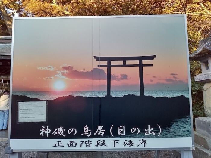 海岸の岩場に立てられた鳥居、その先に見える日の出が有名です。