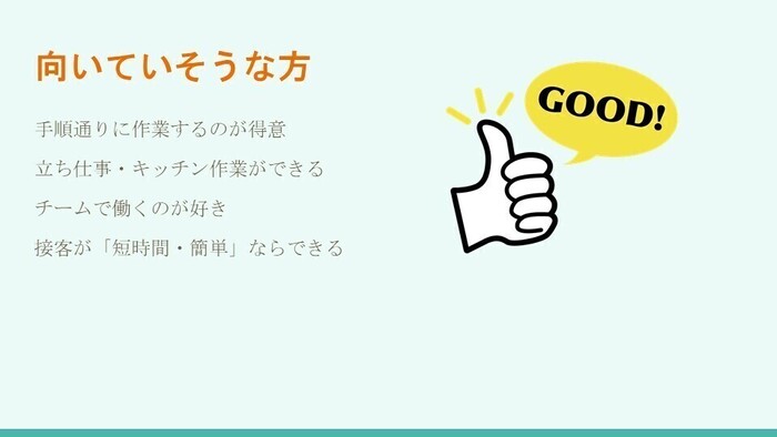 まず、手順通りに作業するのが得意な方。調理は順番が決まり切っていてアドリブなどはないので、マニュアル型の方には良いと思います。