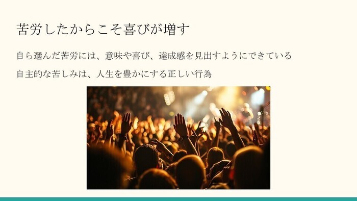 これは要するに、苦労したからこそ成功したときの喜びが増すということです。