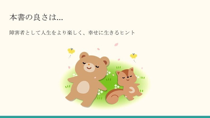 私は本書を読んで、障害を持っていながらも人生をより楽しく、幸せに生きるヒントが満載されていると感じました。