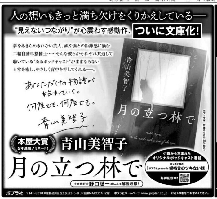 「月の立つ林で」 青山美智子著 ポプラ社発行 https://www.poplar.co.jp/book/search/result/archive/8008405.html