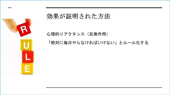 それは、心理的リアクタンス(反発作用)と呼ばれ、やめたいことをやめようとするのではなく、逆に「毎日絶対やらなければならない」とルール化する方法です。