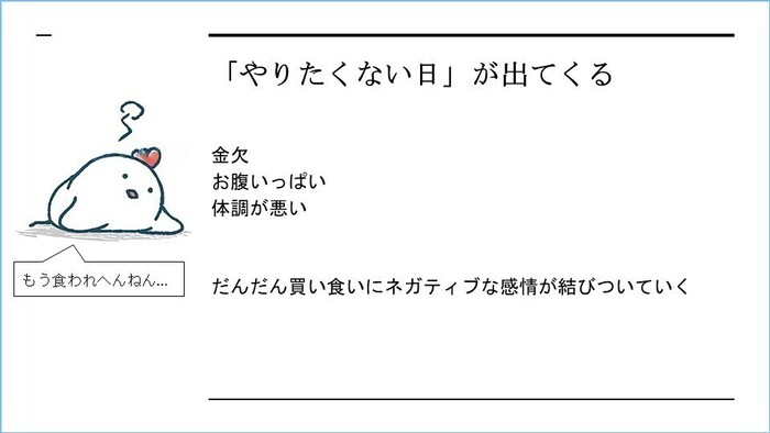 すると、だんだん買い食いという行為にネガティブな感情が結びついていき、一気にモチベーションが落ちていくわけです。