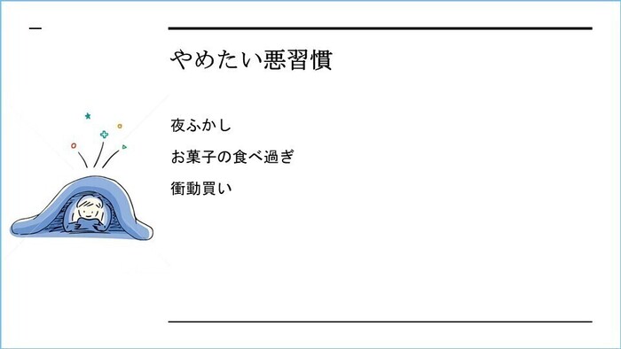 私も夜ふかししがちだったり、スーパーやコンビニで新商品があるとすぐ買ってしまうなど、やめたいことがいくつかありました。