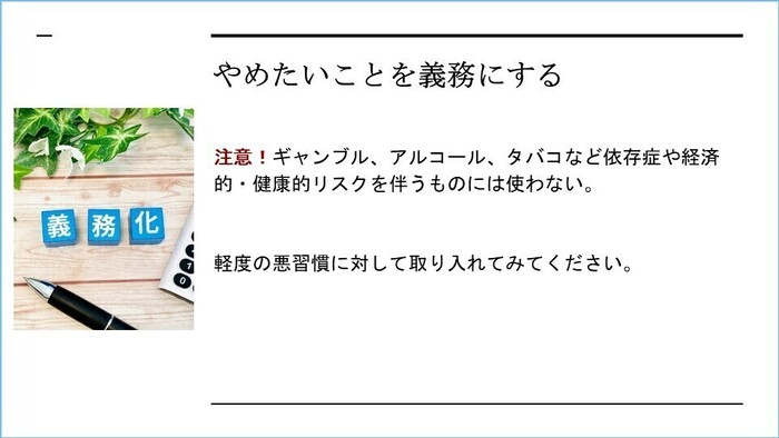 このように、やめたい習慣ほど「絶対やらないといけない」と義務化することで、逆にモチベーションを下げるという方法があります。