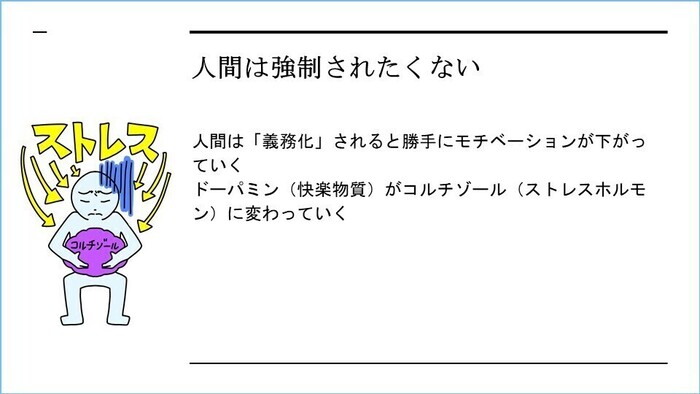 このように人間は「義務化」されるとドーパミン(快楽物質)がコルチゾール(ストレスホルモン)に変わっていき、勝手にモチベーションが下がっていきます。