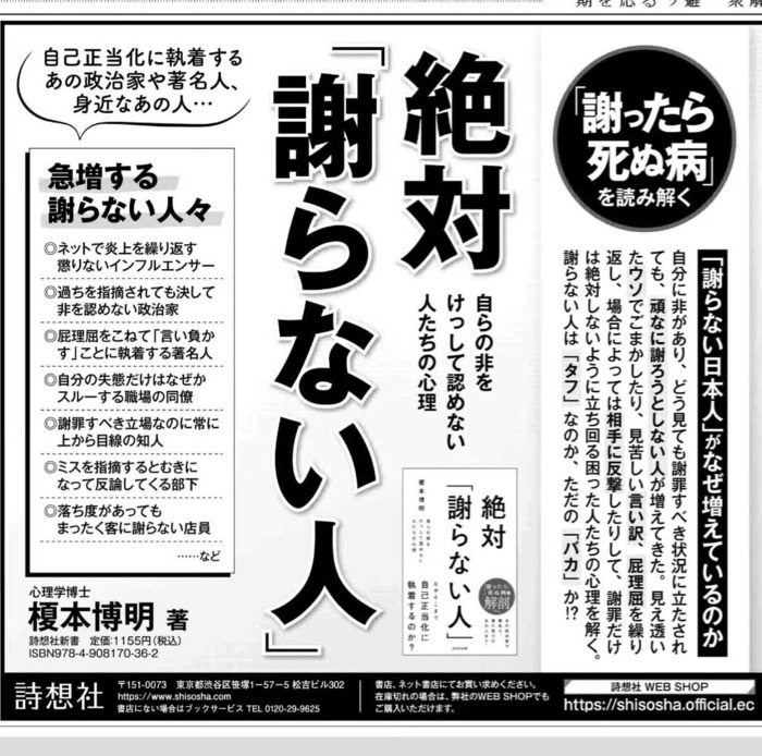 絶対「謝らない人」 榎本博明著 詩想社発行
