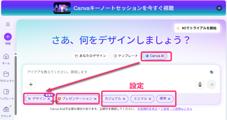まず、Canvaのトップページにある検索窓に、次のようなプロンプトを入力してもらいました。