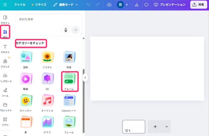 まず、メニューから「プレゼンテーション」を選び、左のメニュー「素材」からカテゴリーの「フォーム」を選択。