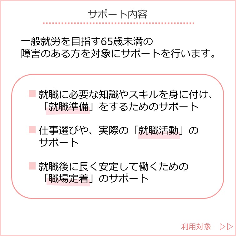就労移行支援は、就職を希望しているが、さまざまな困難によりうまくいかないといった、障害・難病などの方を対象に、一般企業で働くために必要な知識・スキル向上のサポートをおこないます。また、求人検索、面接練習、書類添削等、就職活動の支援や、通院、面接同行などの支援もおこないます。