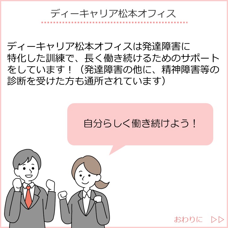 ディーキャリア松本オフィスは、長野県松本市にあり、特に発達障害の支援に応じた、『就労移行支援事業所』です。カリキュラムを通してあなたの個性と向き合い、「自分らしく長く働ける力」を身に付けるお手伝いをいたします。