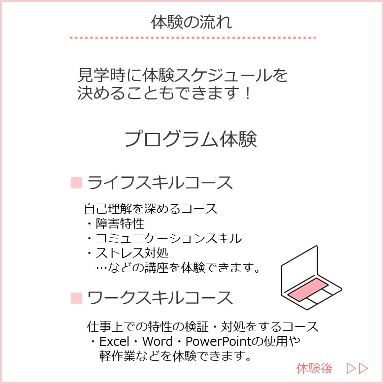 Instagramでは他にも見学・体験前に知りたい事、就活や、ASD・ADHD等の発達障害の特性・自己対処や合理的配慮の事例等をご紹介しています。