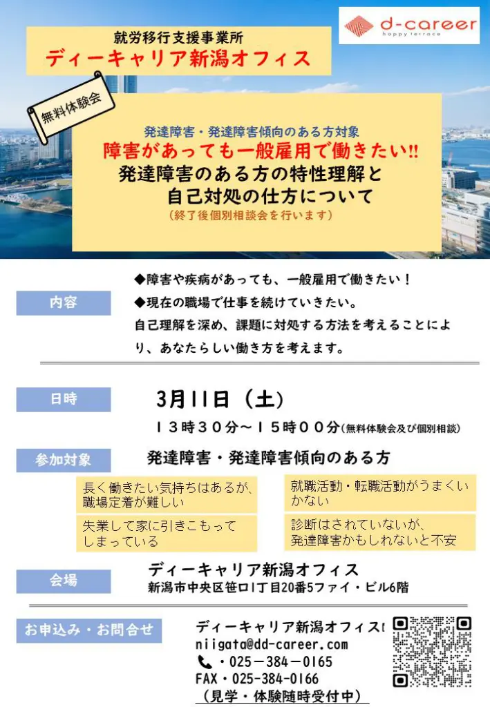 ディーキャリア 新潟オフィスは大人の発達障害の特性に応じたプログラムの就労移行支援事業所です。 精神障害・発達障害がある方を対象に就労支援を受けることができ、 「働き続けるためのプログラム」で高い職場定着率を実現しています。 随時見学を受け付けております。 就労移行ってどんなとこ? どんなプログラムをしているのかな・・・ 興味がある方はお気軽にお問合せください(^^♪