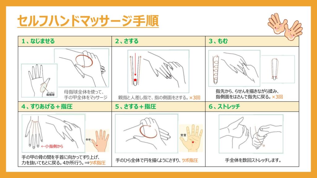 ↑全6行程のマッサージ。自身の手に1つずつ確認しながら練習しました。