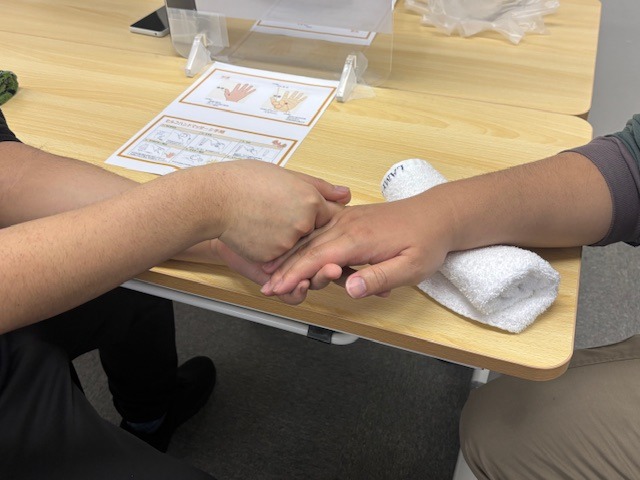 自身の手元をマッサージした後、希望された方のみ対面実習にチャレンジしました。