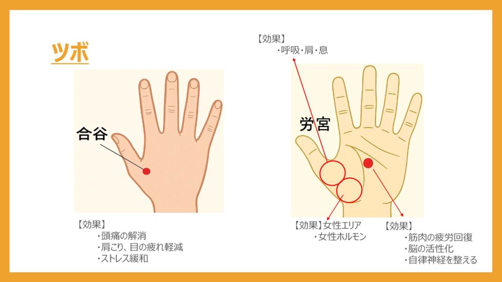 - ツボ「合谷」「労宮」確認する。痛いと感じた部分は、ゆっくりとほぐす。