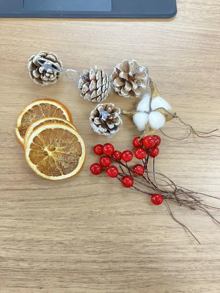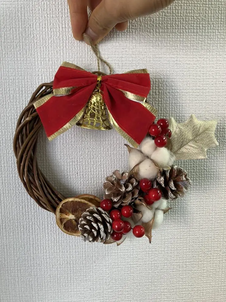 クリスマスツリーを作っていてくれた利用者から余ったオーナメントをもらってアクセントになりそうな葉っぱとリボンを付けました!!
