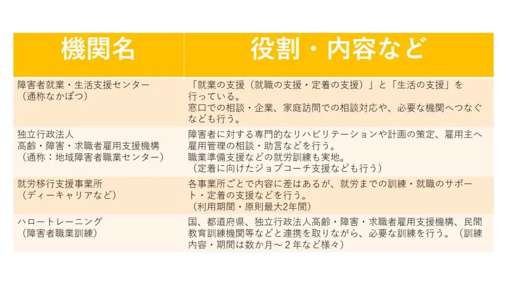 まずは、就職までに活用できる機関や、それぞれがおこなっているサービスについて、