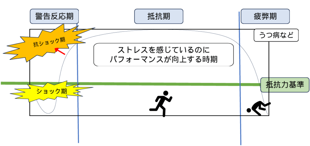 ストレスに対して抗う時期(抗ショック期)、ストレスを感じているのにそれに抗い、走り続ける時期があります。この時期パフォーマンスが向上するとありますが、必ずしも成功するうまくいく時期というわけではなく、むしろ行動力は上がっているのに、うまくいかない失敗ばかり繰り返す時期ともいえます。その結果「抵抗基準」よりも、抵抗する力が下がり、いわゆる「疲弊」「疲労困憊」「起き上がれない」といった症状を発症するのです。