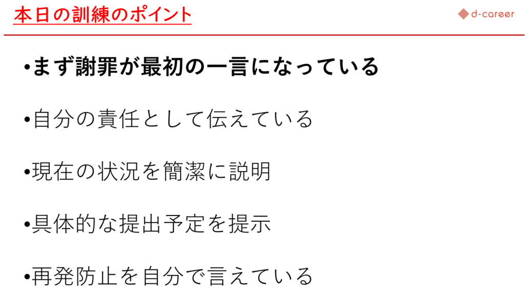 「①謝罪 → ②状況説明 → ③対策」の順番で相手に伝えられるようになること