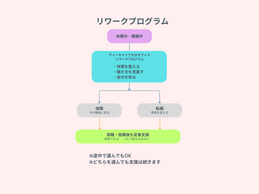 ディーキャリア大分オフィスのリワークは、”今の職場に戻るかどうかまだ決められない…”、決断する前から利用できるプログラムです。あなたの回復と選択を同時に支えていきます!このリワークは、”迷ってもいい、まだ決められなくてもいい”その前提からスタートします。
