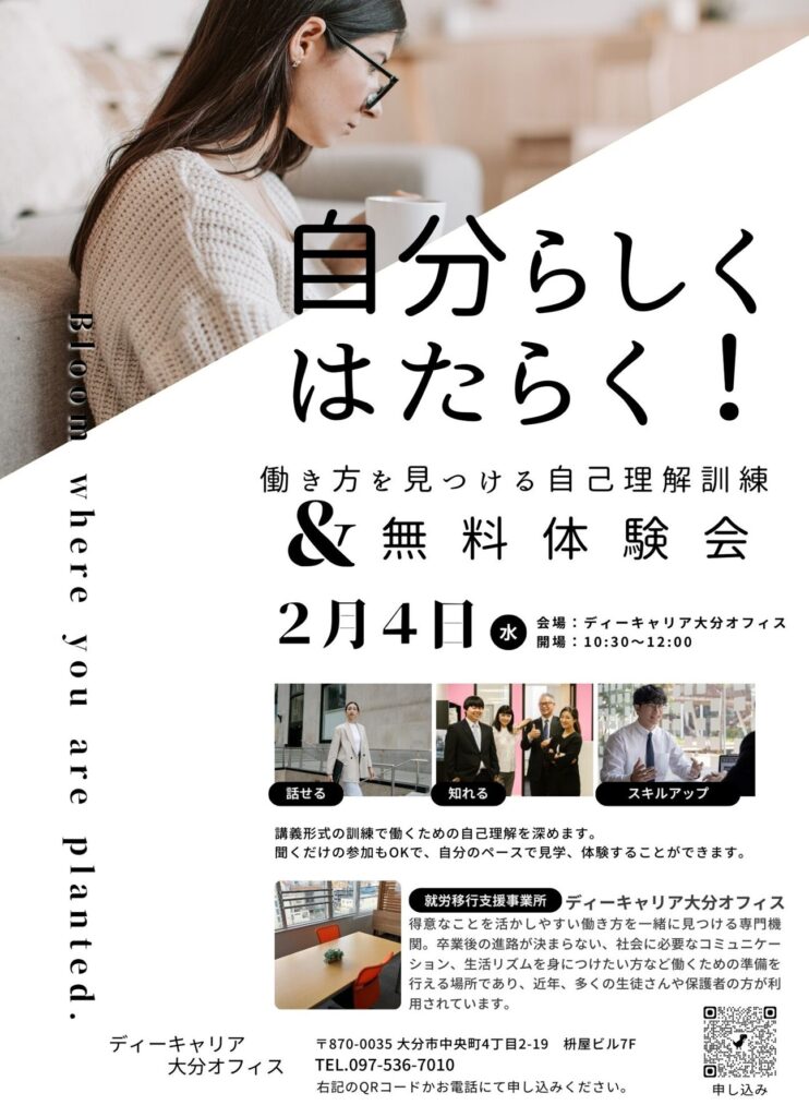 自分らしく働いていくために必要な自己理解について学べる訓練の無料体験会です。