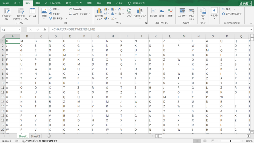 操作1:Sheet1のセル一つずつにランダムなアルファベットを一文字入力する関数を敷き詰める