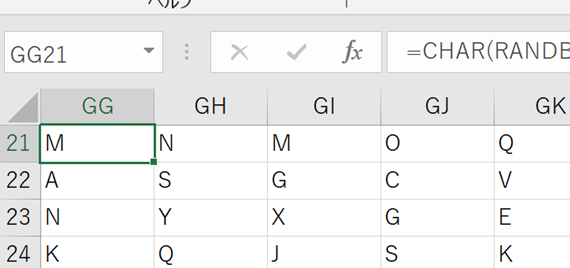 - RANDBETWEEN(65,90) は、65から90までのランダムな整数を返します。これは大文字アルファベットのASCIIコードに対応します(A=65, B=66, …, Z=90)。