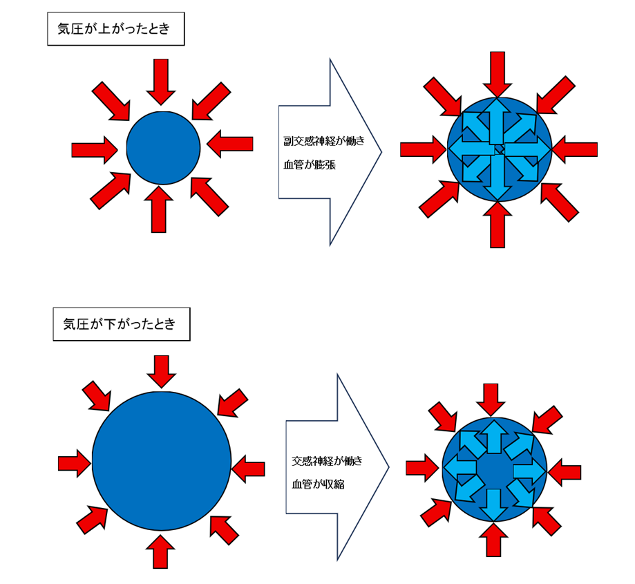 気圧が上がったときは副交感神経が働き、縮まった血管を膨張させます。