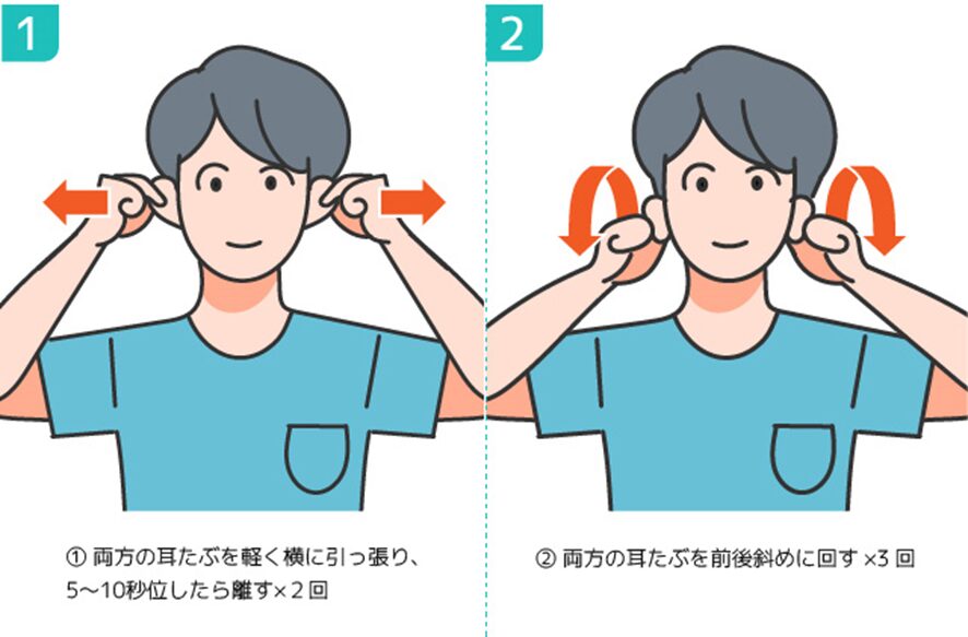 ① 耳たぶを横に軽く引っ張り、その状態を5秒キープする(2回)
