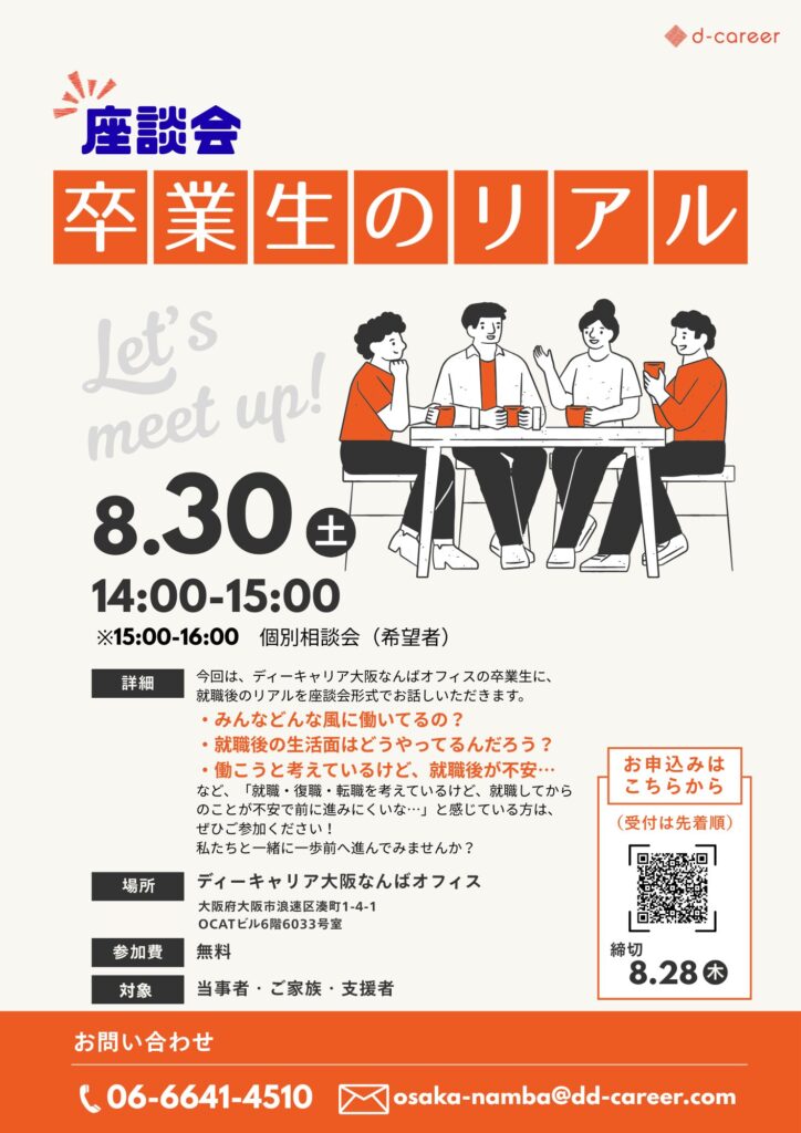 皆さん、こんにちは。ディーキャリア大阪なんばオフィスです。今週のブログは、タイトルにもある8月に事業所でおこなうイベントについてご紹介したいと思います!チラシも掲載するので、ご興味がある方は是非参加してくださいね!
