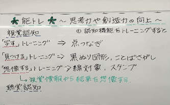 まずは視覚認知の点つなぎやことば探し、線対象などの個人トレーニングから開始!最後は聴覚認知でグループワークをおこないました。