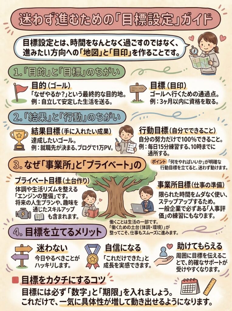 目標設定とは、単に予定を決めることではありません。進みたい方向への「地図(目的地)」と「目印(ステップ)」を作ることです。今回は、迷わず一歩を踏み出すためのガイドを、論理的かつ視覚的に整理してお伝えします。