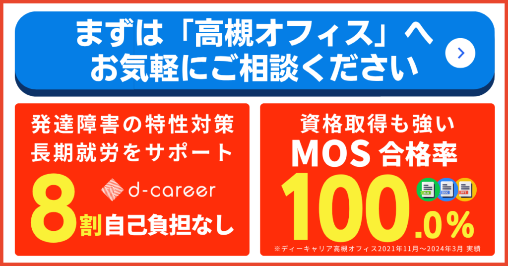 ディーキャリア高槻オフィスはPC学習環境の整った事業所なので、WordやExcelなどの基本的なPCスキルを身に着けたい方にも多くご利用いただいています。