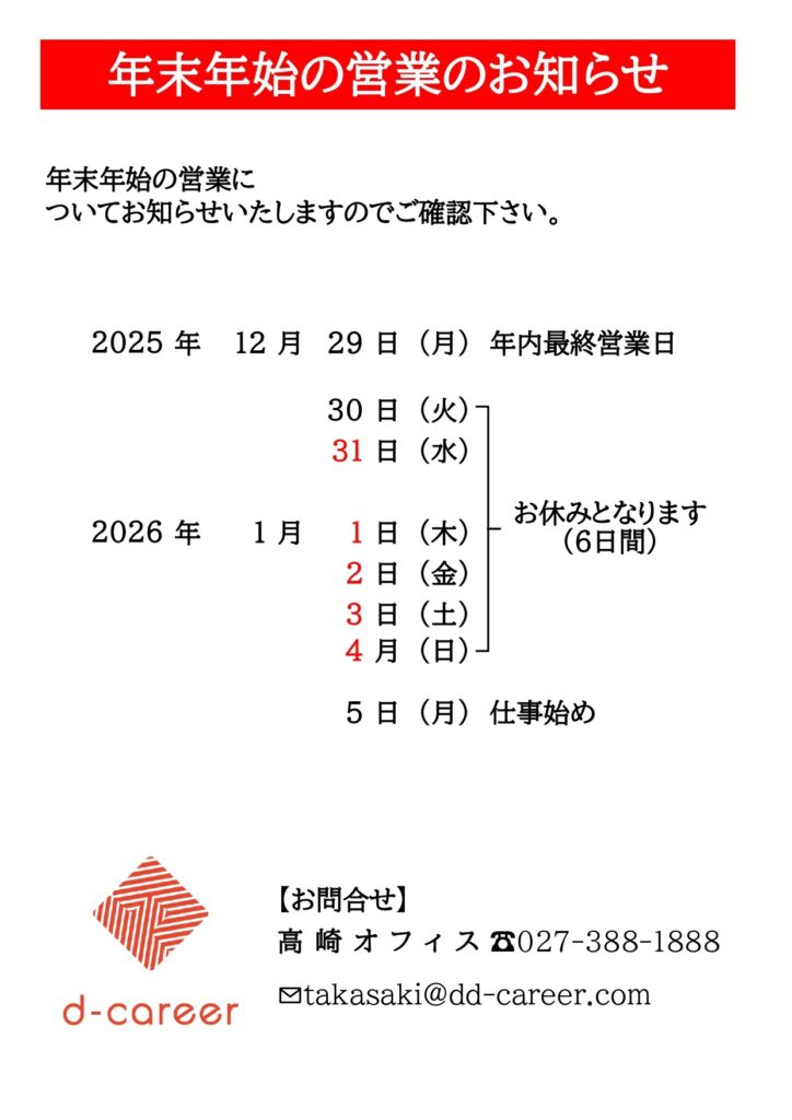 年末年始営業のお知らせ【ディーキャリア高崎オフィス】