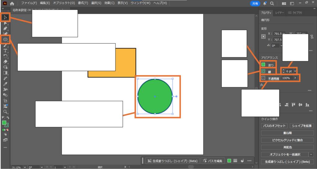 オブジェクトの編集では、基本的な要素として「塗り」「線」「線幅」「不透明度」を調整することができます。「塗り」はオブジェクトの内部の色を変更することができ、「線」はいわゆる「枠線」と同じような意味で、こちらも線の色を変えることができます。「線幅」は文字通り線の幅を調整することができて、「不透明度」は数値を低くしていくことで、徐々にオブジェクトを透明にすることができます。