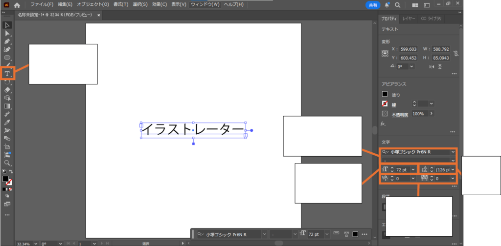 図形以外にも、文字(テキスト)をイラストに加えて、尚且つ編集することもできます。文字を加えるには、「文字ツール」を使います。Excelなどのテキストボックスと似た要領で入力することができ、文字ツールを使ってアートボードに文字を入力したい箇所にクリックまたはドラッグすることで、文字を入力することができます。入力した文字は図形のオブジェクトと同様に色や不透明度を調整することができ、他にも特有の設定として、文字のフォントを設定する、文字の大きさ、行間、文字同士の間隔も調整することができます。