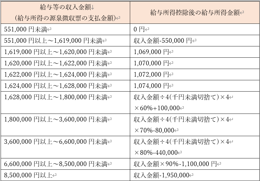 まず、給与所得控除とは、課税所得金額に応じて増加する控除額になります。所得が多ければ多いほど控除額も増加します。給与所得控除後の金額は下記の表の通りになります。