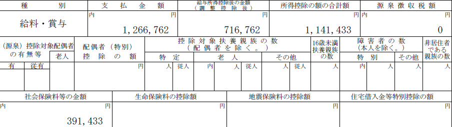 1番上の行の支払金額1,266,762円が給与収入にあたります。まずはここから給与所得控除を差し引いて給与所得を算出します。給与収入が551,000円以上~1,619,000円未満の場合は、収入金額-550,000円が給与所得になります。