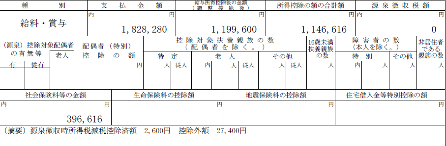 基礎控除額と障害者控除額は金額が固定であり、社会保険料控除額は画像の1番左下に記載されている金額になります。