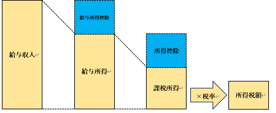 (給与収入-給与所得控除-所得控除)×税率-税額控除=所得税額