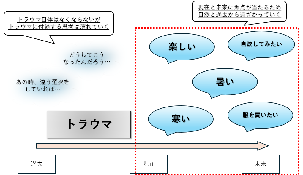 現在・未来に対してフォーカスすることで過去から遠ざかり、トラウマに関するできごとが次第に薄れていきます。トラウマ自体が完全になくなるわけではありませんが、そこに目を向けないよう意識することでフラッシュバックをある程度抑えることが期待できます。