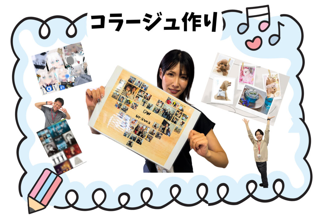 今回は、自立訓練で金曜日に実施したいイベント【コラージュ作り】の様子をについてご紹介します。 今回はPCを使って「コラージュ作り」に取り組みました。ネットで画像を検索したり、好きな写真を取り込んで編集したりと、デジタルならではの表現が広がりました。オリジナルでレイアウトにこだわる人、サンプルを参考にしながらアレンジを楽しむ人など、それぞれのペースで作業を進めました。中でも“推し”の画像を組み合わせた作品が多く、「この写真が一番好き!」「ここはあえて余白を残したい」など、細かな部分にも熱意が感じられました。自分の「好き」をカタチにする時間となり、完成した作品には自然と笑顔がこぼれました。