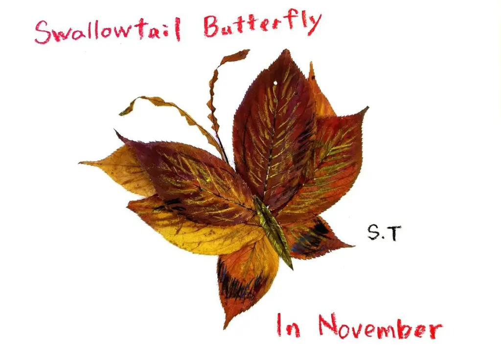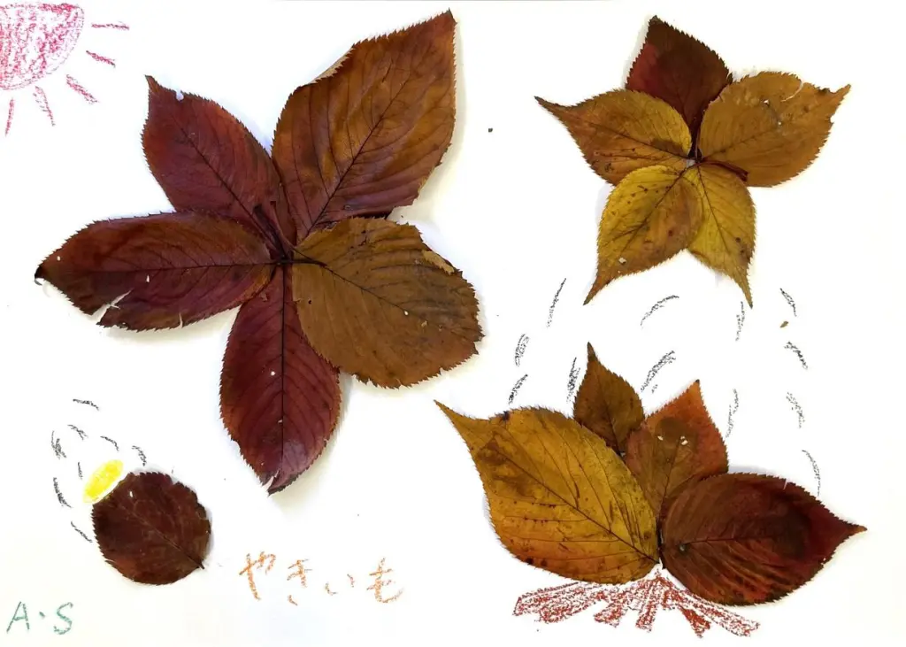 自分自身でも、落ち葉を使って作品を作ったこともありました。枯れ葉をみて、色や大きさが違ったり、虫に食われた葉もあって、人間が一人一人違うように、枯れ葉も一枚一枚違うのが面白いと思いました。それぞれ、味わいがあります。今回のアート講座では、落ち葉に触って、感動してもらいたいと思いました。