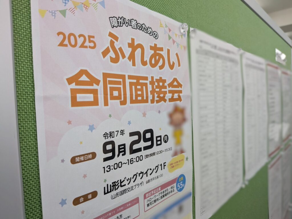 個別の求人情報だけでなく、地域で開催される就労イベントの情報もタイムリーにお知らせしています。今月は「障がい者のためのふれあい合同面接会」が開催される予定で、早速ポスターを掲示していました。